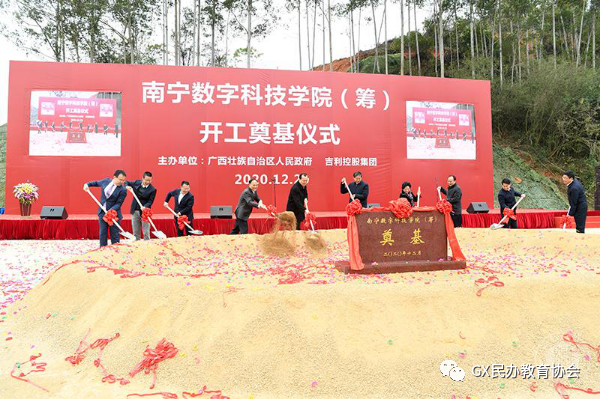 2020年12月20日上午,广西民族大学相思湖学院转设项目南宁数字科技学院(筹)在南宁市开工建设。开工奠基仪式由自治区人民政府和吉利控股集团主办。全国工商联副主席黄荣,全国工商联副主席、吉利控股集团董事长李书福,自治区副主席费志荣,自治区政协副主席、自治区工商联主席磨长英,自治区党委教育工委专职副书记李晓勇等领导出席开工奠基仪式。